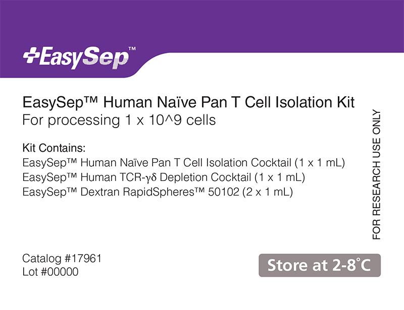 EasySep™ Human Naïve Pan T Cell Isolation Kit (ST-17961) は、新鮮もしくは凍結したヒト末梢血単核細胞 (PBMC) やウォッシュした白血球アフェレーシスサンプルから、Naïve Pan T細胞を免疫磁気ネガティブセレクションで単離する製品です。
