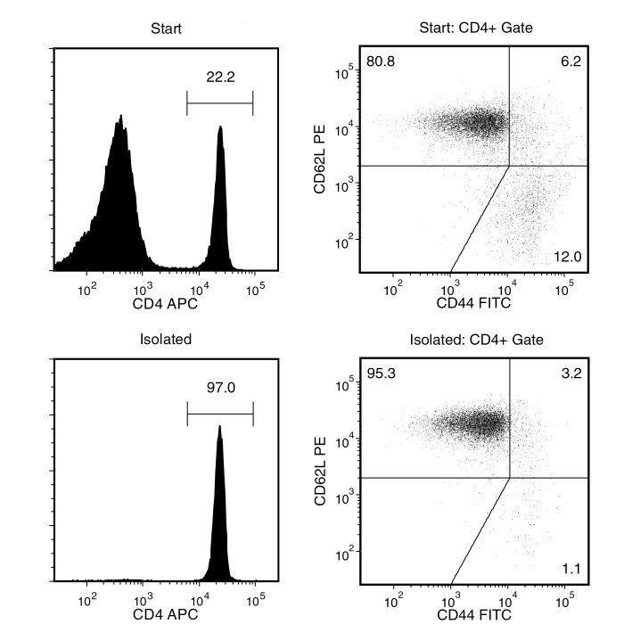 Starting with a single-cell suspension of splenocytes, the naïve CD4 + T cell (CD4+CD44low CD62Lhigh) content of the final isolated fraction typically ranges from 91.7% - 96.7%. In the example above, the final purities of the start and isolated fractions are 17.9% and 92.4%, respectively.
