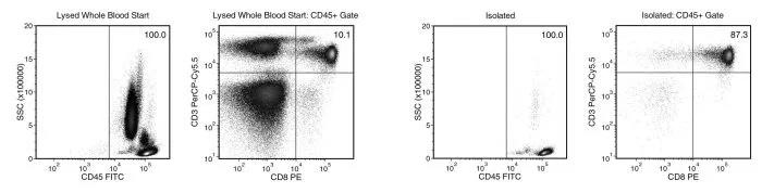 Starting with human whole blood from normal healthy donors, the typical CD8+ T cell (CD3+CD8+) content of the non-lysed final isolated fraction is 82.4 ± 4.9% (gated on CD45) or 81.6 ± 4.9% (not gated on CD45). In the example above, the CD8+ T cell (CD3+CD8+) content of the lysed whole blood start sample and non-lysed final isolated fraction is 10.1% and 87.3% (gated on CD45), respectively, or 10.1% and 87.3% (not gated on CD45), respectively. The starting frequency of CD8+ T cells in the non-lysed whole blood start sample is 0.018% (data not shown).