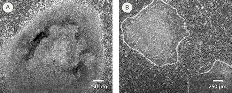 ReproRNA-OKSGM を用いて樹立したiPS細胞コロニーを示しています。ReproTeSR で誘導したiPS細胞コロニーは、標準的なヒトES細胞用培地の場合と比べて、境界が明瞭でコンパクトな形態です。