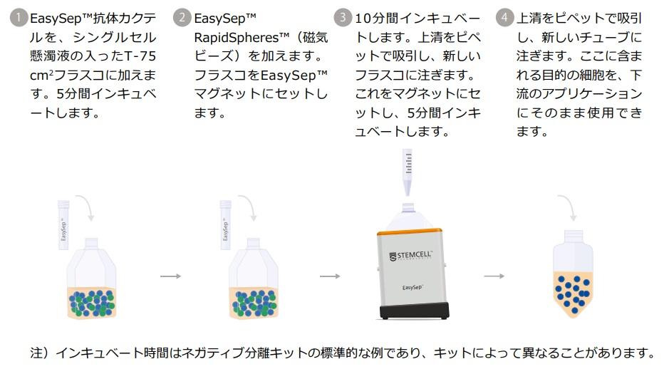 EasySep™細胞分離試薬 および Easy 250 EasySep™磁石 を併用し、最大125 mLの新鮮Leukopakサンプルから高純度の細胞を分離できます。