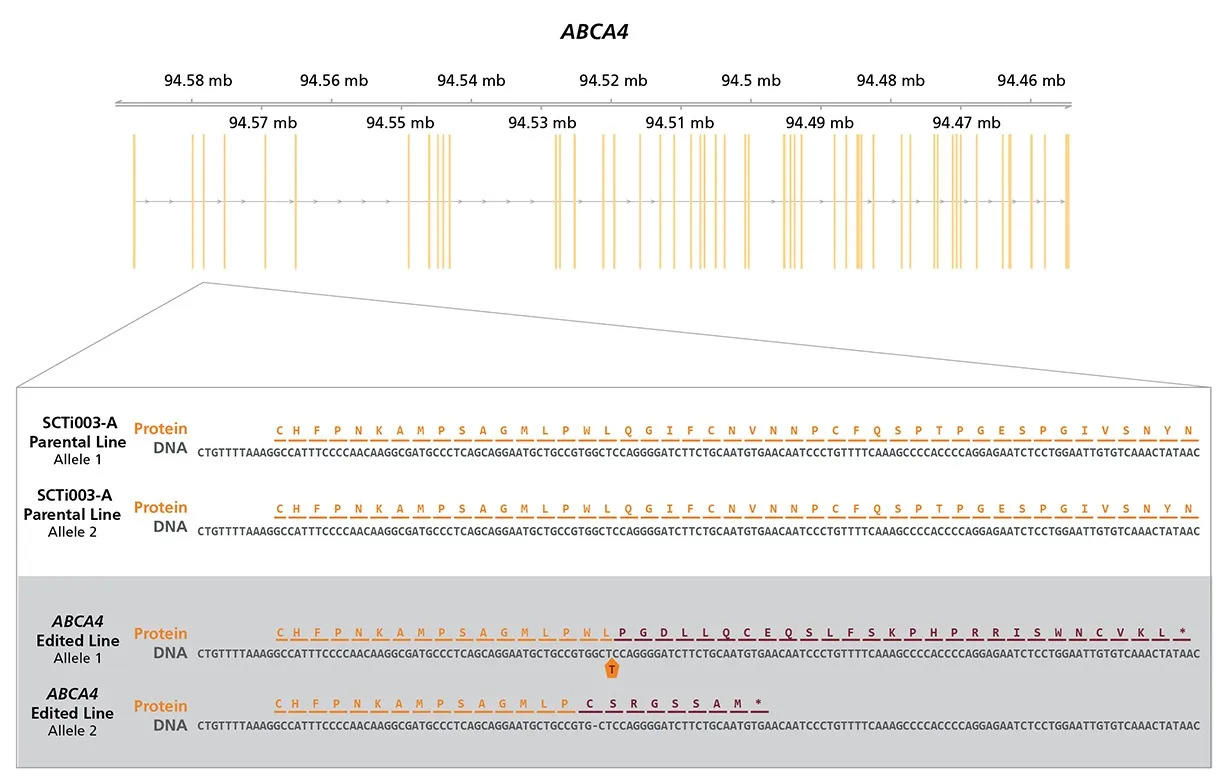 本品は、十分に特徴付けられた健康なコントロールhiPSC株であるSCTi003-A株に由来し、内因性ATP結合カセットサブファミリーAメンバー4(ABCA4)遺伝子をCRISPR-Cas9を介して編集することで作製されています。ABCA4タンパク質の発現が完全に失われており、ABCA4関連網膜障害の研究に理想的なモデルです。