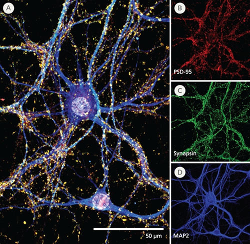 E18ラットの皮質由来プライマリーニューロンをBrainPhys + SM1 Supplementで培養した例です。21日間培養後、広範囲に存在する樹状突起と、シナプス前マーカーのSynapsin(A、C:緑)およびシナプス後マーカーのPSD-95(A、B:赤)の発現・局在から、ニューロンが成熟したことがわかります。またSynapsinは、樹状細胞マーカーMAP2(A、D:青)で示される通り、細胞体および樹状突起に沿って点状に分布しています。