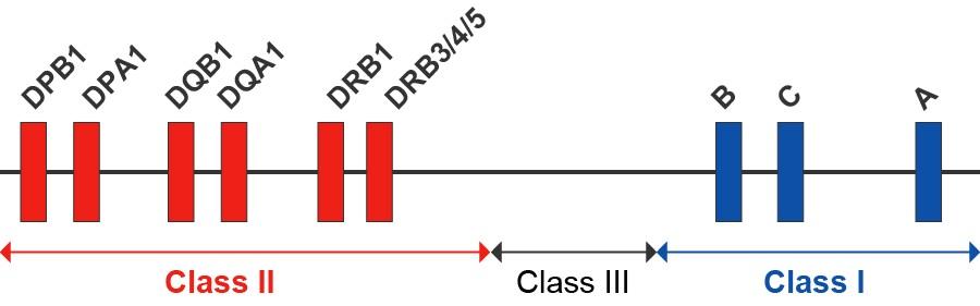 HLAをコードする遺伝子は6番染色体短腕に位置し、約4Mbの領域に密集しています。HLA遺伝子の大きな特徴のひとつに、それぞれが非常に多型性に富むことが挙げられます。HLAの対立遺伝子 (アレル) はクラスIで13,000種以上、クラスIIで4,800種以上に達し (2018年3月時点) 、HLA-DNAタイピング技術の進歩により現在も増え続けています。加えて、この4Mbの領域内にはHLA偽遺伝子 (pseudogene) も多数含まれ、HLAアレルの確実なタイピングをさらに難しくしています。