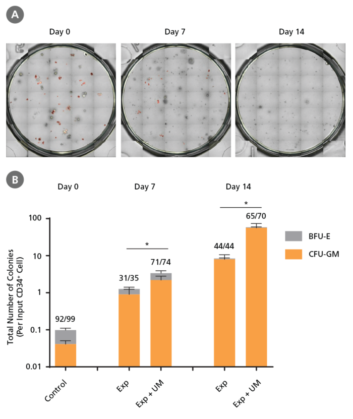 (A)STEMvision™で取得したコロニー画像。コロニー数はこのデジタル画像を基に手動でカウントしました。 (B) インプットしたCD34陽性細胞1個から生じるコロニーの総数を表すCFUアウトプット。CD34⁺ Expansion Supplement (Exp)を添加したStemSpan™ SFEM IIは、コロニー形成中の前駆細胞の増殖をサポートします。UM171はさらにコロニー形成能を亢進します(7日目で〜3倍、14日目で〜4倍の増殖)。UM729を終濃度1 μMで添加した場合も、同様の結果が期待できます。データは平均値± SEMで示しました(n=6)。P値は両側検定のStudent's t検定で算出しました(*P < 0.05)。
