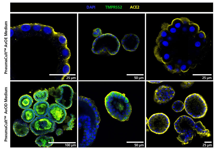 PneumaCult™ Alveolar Organoid Expansion Medium(上段)で増殖し、PneumaCult™ Alveolar Organoid Differentiation Medium(下段)で分化したドナー3名に由来するオルガノイドは、SARS-CoV-2侵入に関連するタンパク質であるTMPRSS2およびACE2を発現しました。ACE2はすべてのドナーと条件で発現しましたが、TMRPSS2の発現はドナーに依存していました。