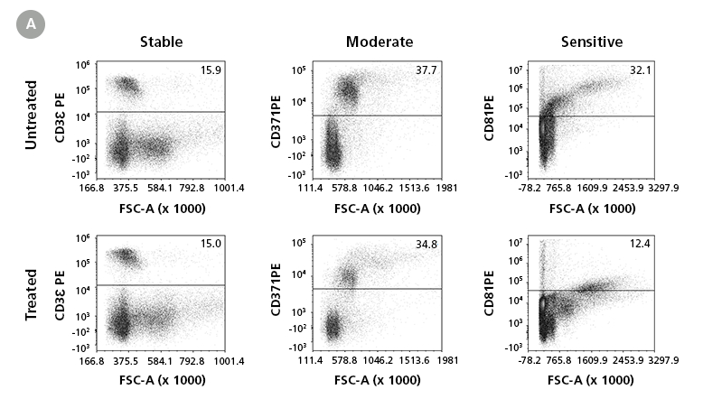 (A)STEMprep™ Mouse Tumor Dissociation Cocktailへの感受性により3つのカテゴリーに分けた各エピトープの代表的なフロープロット:安定した(Stable)CD3(クローン145-2C11)、中程度に影響を受けた(Moderate)CD371(クローン5D3)、感受性の高い(Sensitive)CD81(クローンEat-2)。安定カテゴリーでは、染色強度と陽性率の両方が影響を受けなかった。中程度カテゴリーでは、染色強度は低下したが、陽性集団は未処理群と同様に区別できた。感受性の高いカテゴリーでは、検出性が低下し、下流の実験や結論に影響する可能性がある。