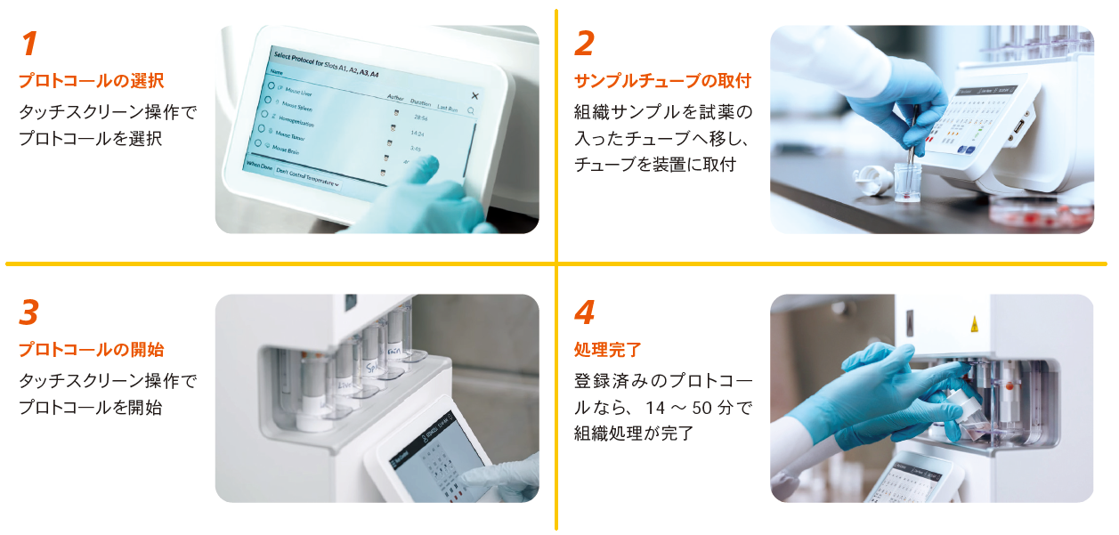 以下の手順により、登録済みプロトコールなら14~50分で組織処理を完了できます。