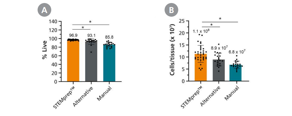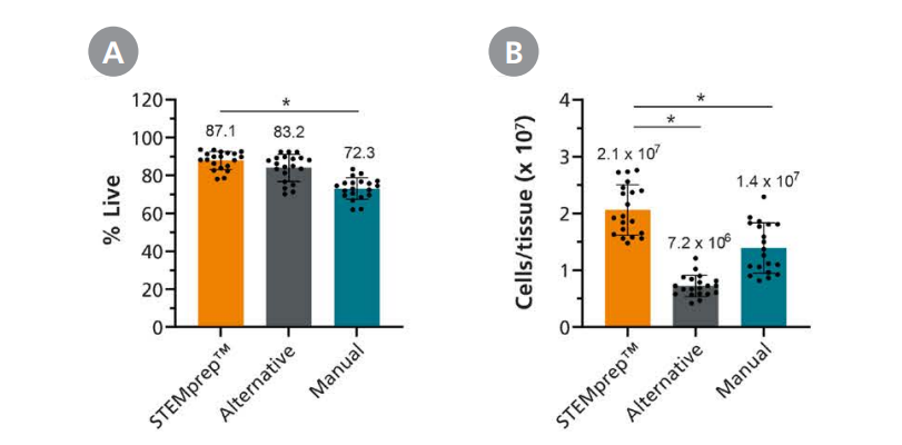 STEMprep™ Tissue Dissociatorは、幅広い固形組織に対応し、効率的で再現性が高く、高収量のシングルセル懸濁液を自動調製できます。さらに、エピトープの完全性と細胞機能も保持します。
