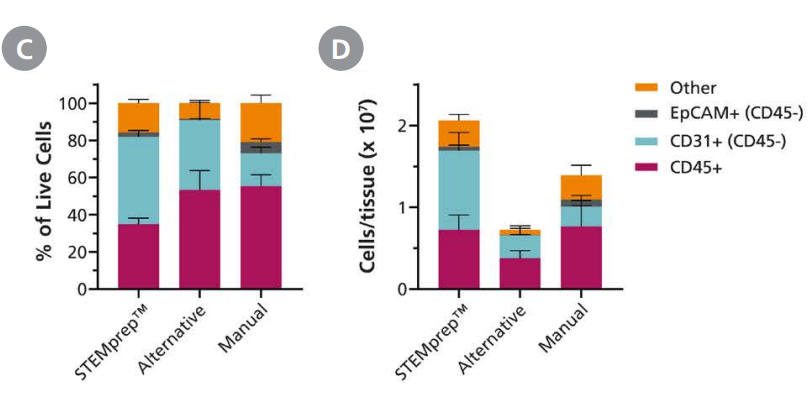 マウス肺を、STEMprep™ Tissue DissociatorとSTEMprep™ Mouse Lung Dissociation Kit(#ST-100-2135)を使用した方法(STEMprep™)、他社装置(Alternative)、または手作業(Manual)で、シングルセル化処理した。(A)全有核細胞の生存率、(B)全肺組織(251-495 mg)あたりの生存細胞の収量、(CおよびD)CD45+免疫細胞、CD31+血管内皮細胞、EpCAM+上皮細胞の割合および収量。生存率、収量、およびサブセット構成はフローサイトメトリーにより評価した。解析前に、赤血球は塩化アンモニウム溶液で溶血させた。データは平均±SD(n = 20)で示し、* p < 0.05、Tukeyの多重比較検定を用いた一元配置分散分析により有意差を評価した。