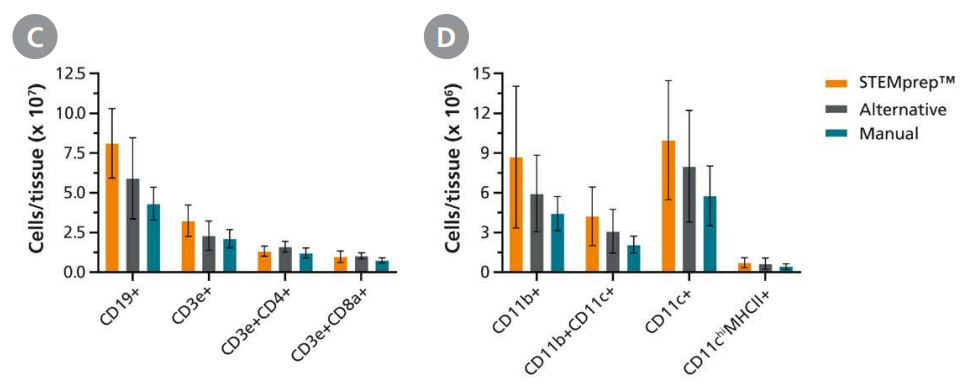 マウス脾臓を、STEMprep™ Tissue DissociatorとSTEMprep™ Mouse Spleen Dissociation Kit(#ST-100-2138)を使用した方法(STEMprep™)、他社装置(Alternative)またはSpleen Dissociation Medium(#ST-07915)を使用した手作業(Manual)で、シングルセル化処理した。(A)全有核細胞の生存率、(B)全脾臓組織(63-152 mg)あたりの生存細胞の収量、(CおよびD)脾臓のリンパ系および骨髄系サブセットの収量。生存率、収量、およびサブセット構成はフローサイトメトリーにより評価した。解析前に、赤血球は塩化アンモニウム溶液で溶血させた。データは平均±SD(n = 17-26)で示し、p < 0.05、Tukeyの多重比較検定を用いた一元配置分散分析により有意差を評価した。