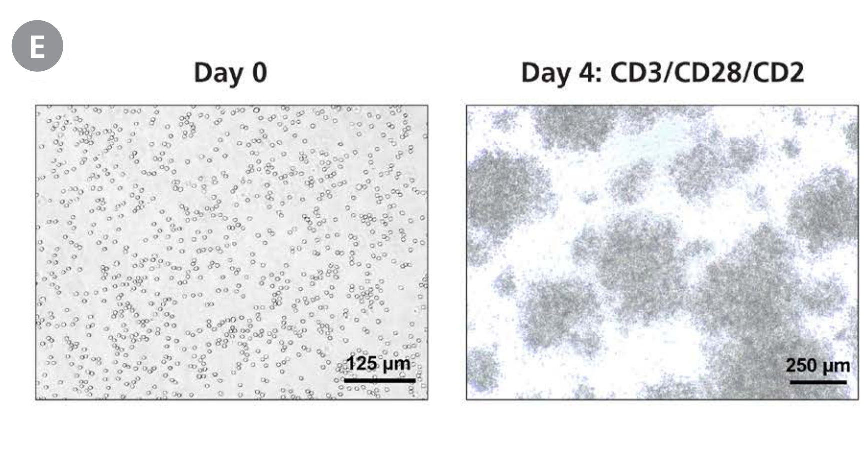 マウスの脾臓から、STEMprep™ Mouse Spleen Dissociation Kit(#ST-100-2138)およびSTEMprep™ Tissue Dissociatorを用いてシングルセル懸濁液を調製した。(A)その後、EasySep™ Mouse T Cell Isolation Kit を用いて脾臓由来のT細胞を単離した。T細胞を200 µLのImmunoCult™-XF T cell Expansion Mediumに2 × 10⁵個/mLの濃度で播種し、IL-2(50 U/mL)の存在下でImmunoCult™ Mouse T Cell Activatorを用いて4日間活性化した。(B)培地のみ、またはImmunoCult™ Mouse T Cell Activator CD3/CD28もしくはCD3/CD28/CD2の存在下で培養したT細胞の増殖倍率。T細胞のフローサイトメトリー解析により、(C)活性化前(Day 0)と活性化後1日目(Day 1)におけるT細胞活性化マーカーCD25の発現、ならびに(D)Day 0とDay 4におけるCellTrace™ Violet標識T細胞の増殖を示した。(E)Day 0とDay 4のT細胞培養の代表的な光学顕微鏡画像。データは平均 ± 標準偏差(n = 4)として示した。
