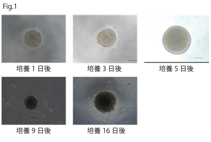 (培養1-5日後 スケールバー:200 μm、培養9-16日後 スケールバー:400 μm)