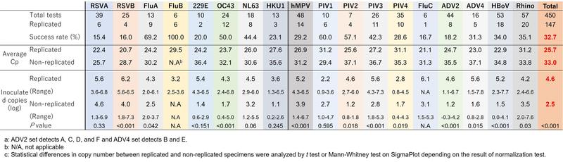 特に、インフルエンザA型(Flu A)およびインフルエンザB型(Flu B)では平均より高い複製成功率が確認された。